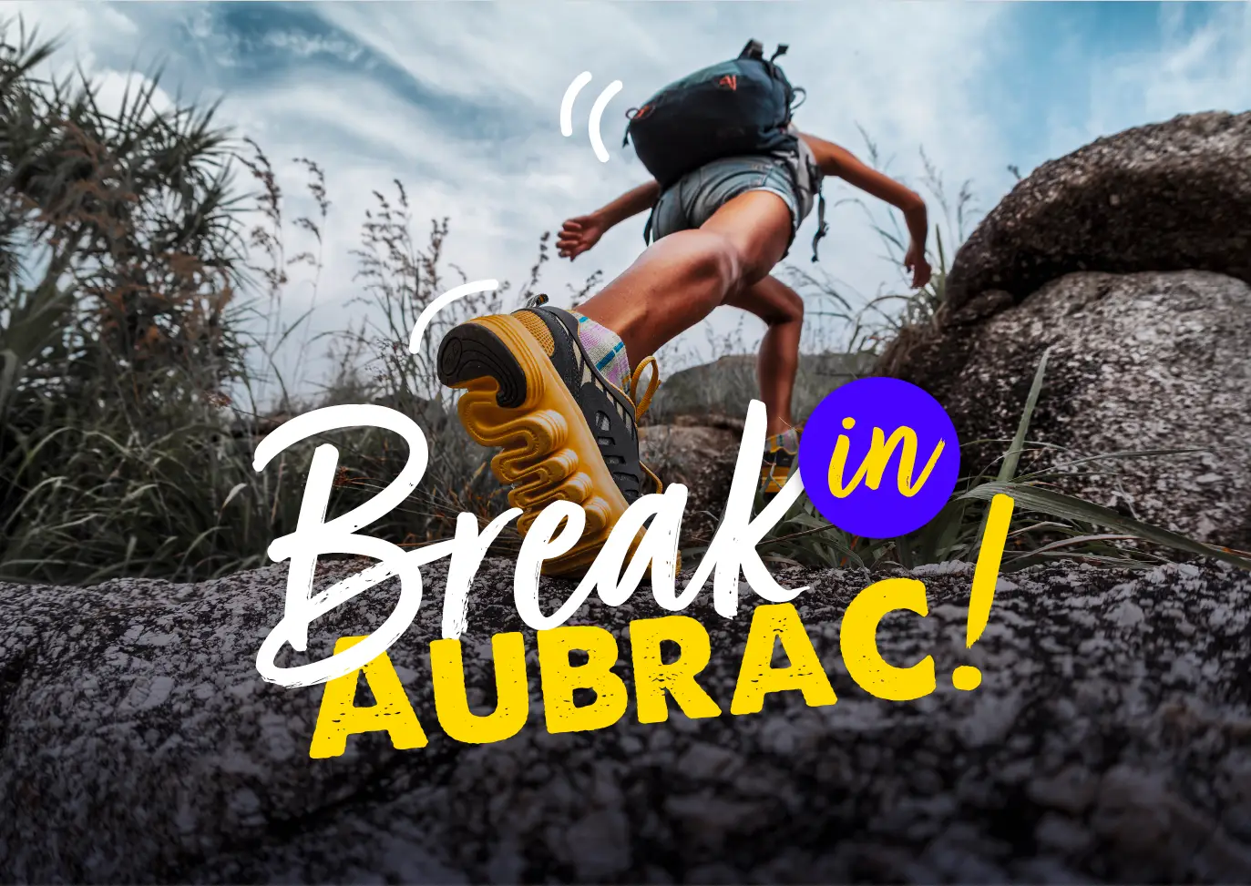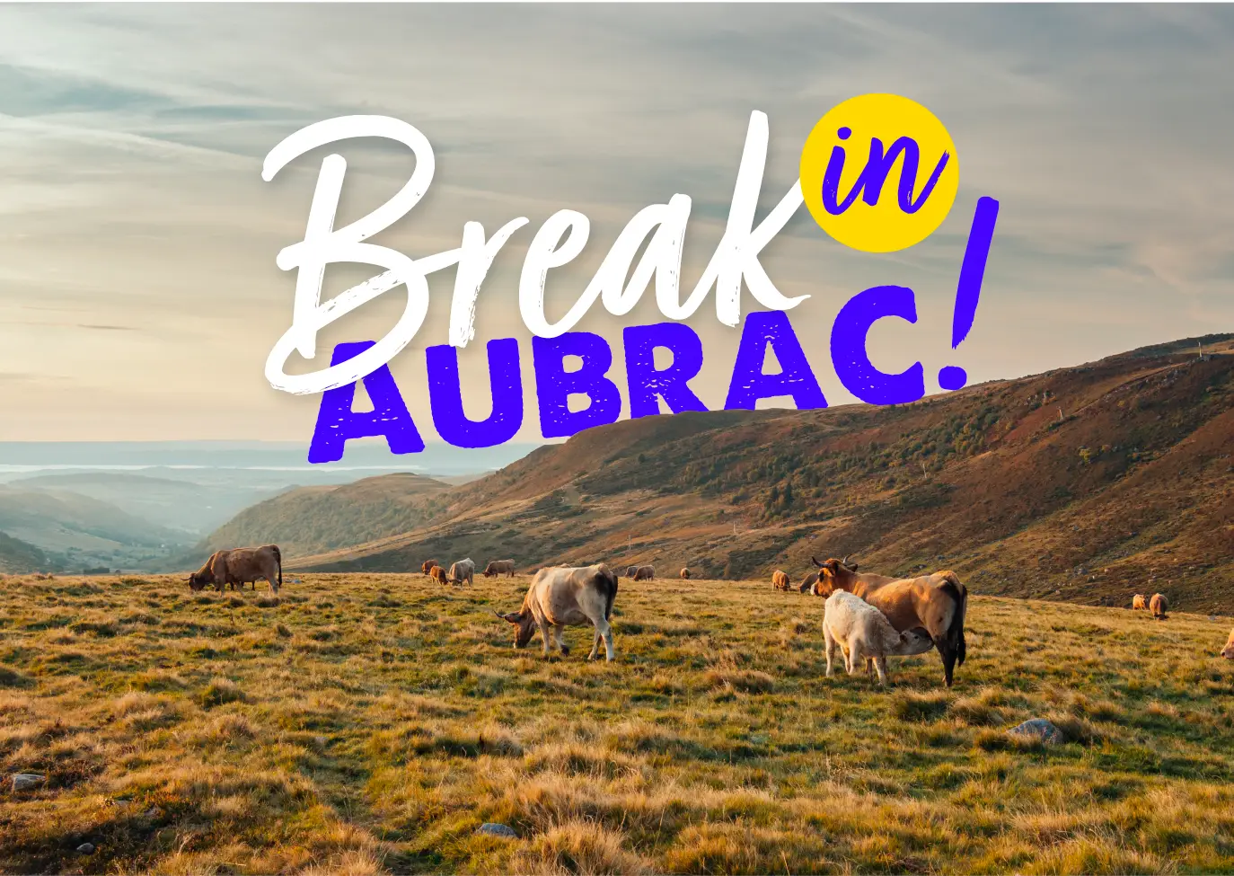 Le slogan “Break in Aubrac” est une invitation directe à faire une pause dans cette région magnifique, à se reconnecter à la nature et à l’essentiel. L’utilisation du terme “break” en anglais ajoute une touche internationale, soulignant l’attrait de la région pour un public plus large, tandis que l’ajout graphique dynamique, avec des bulles et des traits d’accentuation autour du logo, traduit l’aspect fun et vivifiant de l’expérience.