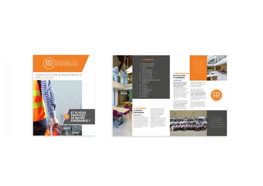 En parallèle du covering des véhicules, la création de plaquettes commerciales a permis de structurer de façon claire et élégante l’offre de la société Rousselin. Ces documents, conçus avec une charte graphique rigoureuse, offrent une présentation détaillée des services tout en restant visuellement attrayants. Les choix graphiques, notamment l’usage de couleurs cohérentes et d’éléments graphiques épurés, permettent une lecture fluide et agréable. Les éléments visuels sont disposés de manière à mettre en valeur à la fois l’aspect technique des prestations de l’entreprise et son engagement en matière de qualité.
